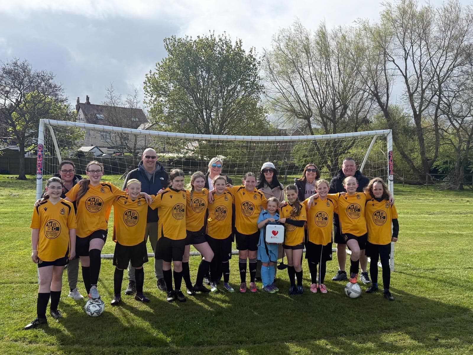 Parents and coaches from Southport FC Girls U12 team receiving their defibrillator after they completed a walk to raise the funding and training from Mark King OBE, Founder of The Oliver King Foundation