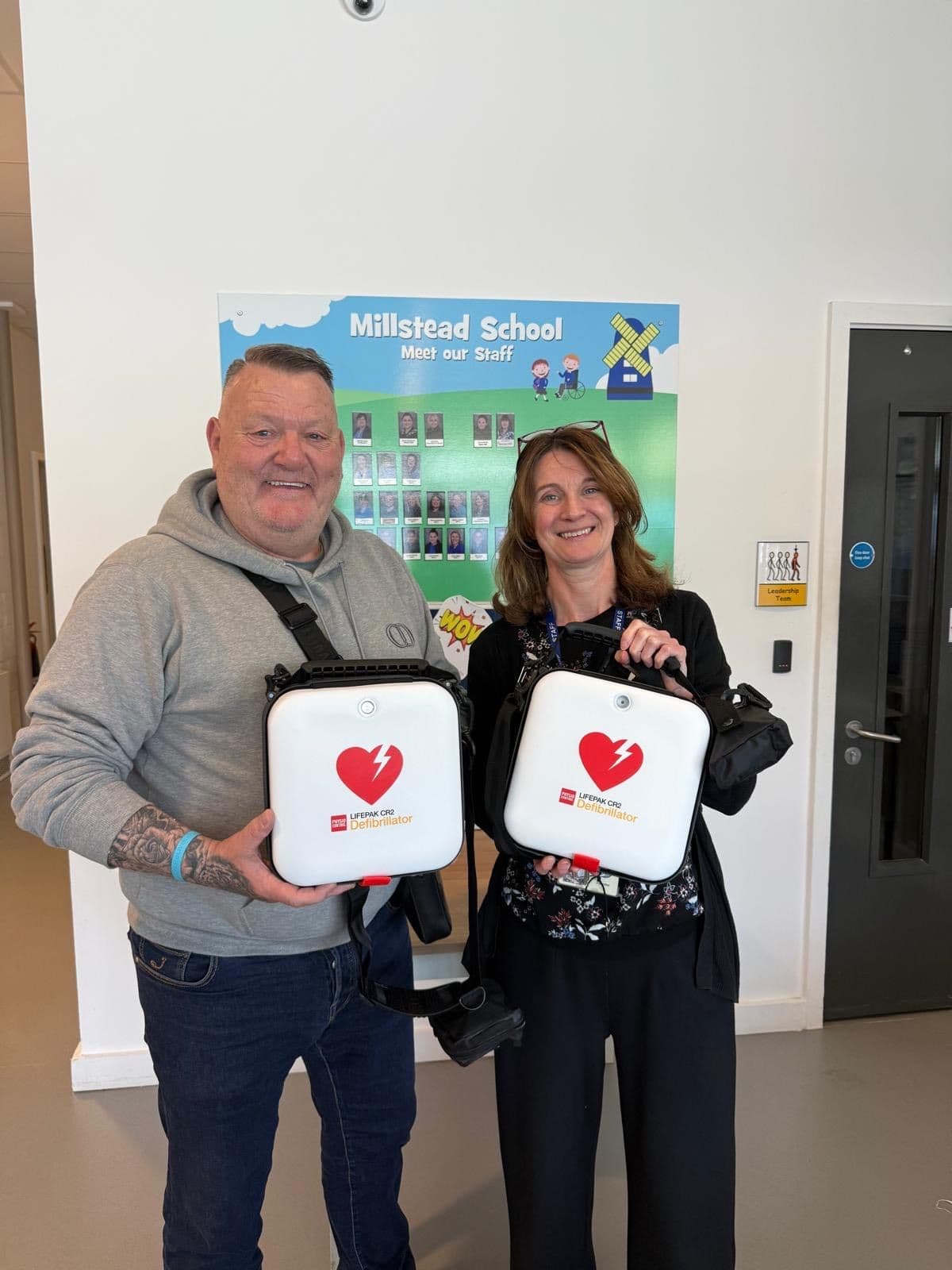 Jo Garster receiving two CR2 defibrillators for Millstead School in Liverpool from Mark King OBE, founder of The Oliver King Foundation, following staff refresher training